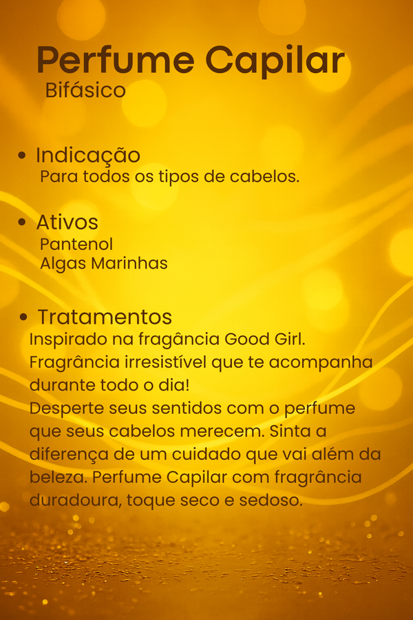 Perfume Inspirado na fragrância Good Girl. Desperte seus sentidos com o perfume que seus cabelos merecem. Sinta a diferença de um cuidado que vai além da beleza. Perfume capilar com fragrância duradoura, toque seco e sedoso