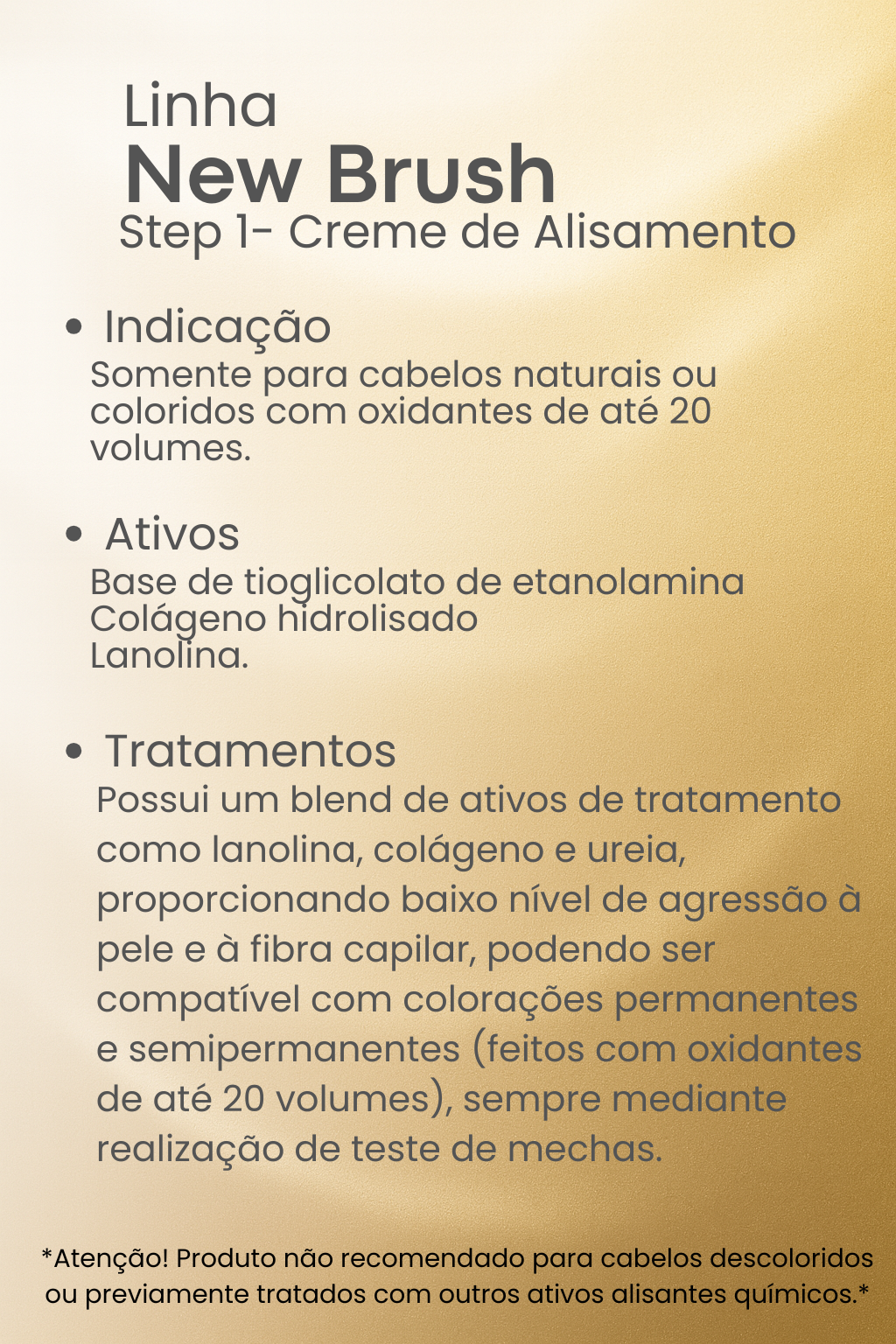 Somente para cabelos naturais ou coloridos com oxidantes de até 20 volumes.