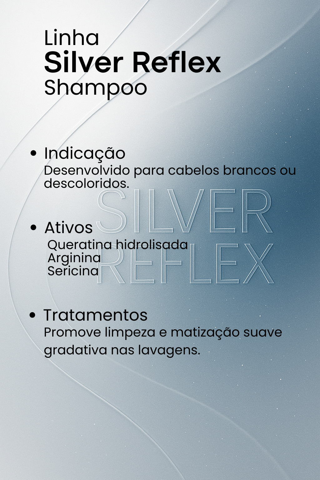 Tecnologia desenvolvida para realçar os reflexos acinzentados nos cabelos grisalhos e neutralizar os tons dourados nos cabelos que passaram por processos oxidativos de mudança de cor.