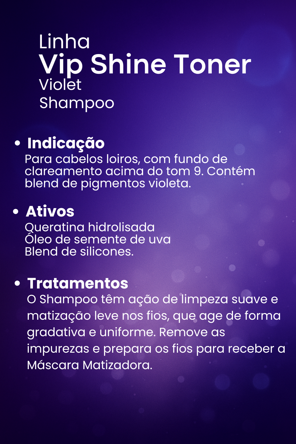O Shampoo têm ação de limpeza suave e matização leve nos fios, que age de forma gradativa e uniforme. Remove as impurezas e prepara os fios para receber a Máscara Matizadora.